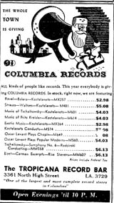 On November 10, 1945, Lloyd Hinton–the owner of Clintonville Electric–opened the Tropicana Record Bar at 3361 North High. It was described as having “a continental atmosphere… with four recording rooms each complete with custom-built high-fidelity sound equipment.” Another description called it a “tropical motif with cabana style wall settings and palm trees completing an atmospheric layout” with 5 listening rooms. The store sold records and record players, and hosted music celebrities for signings and photo ops.