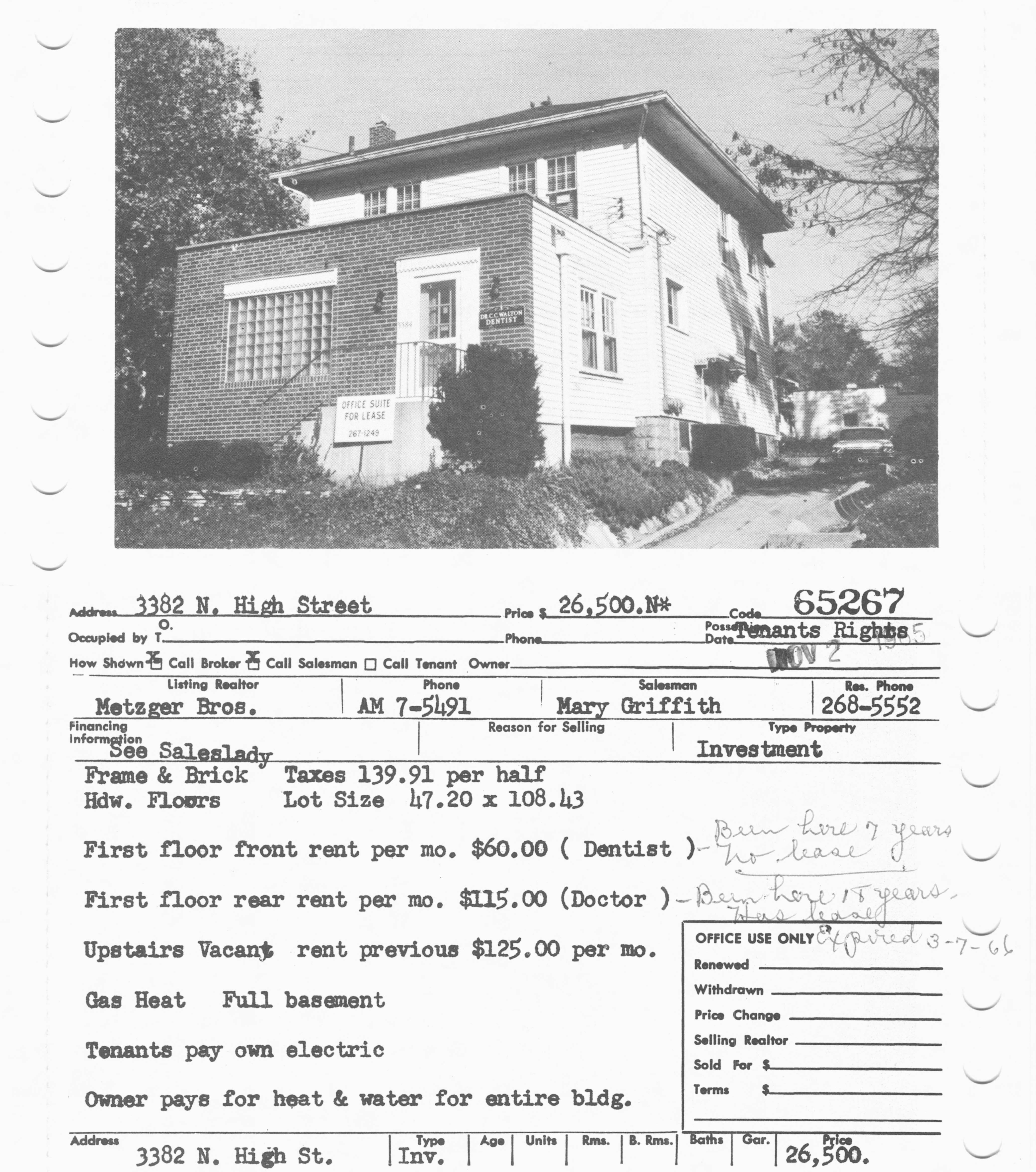 As a small sidenote: this is another location near that corner, probably also torn down to be replaced by the larger white brick building. This is a 1965 picture of a building at 3382-3384 North High, 1 or 2 doors south of the Beth Tikvah assembly house. It housed a dentist in the front, a doctor in the back, and also had space upstairs for another professional.