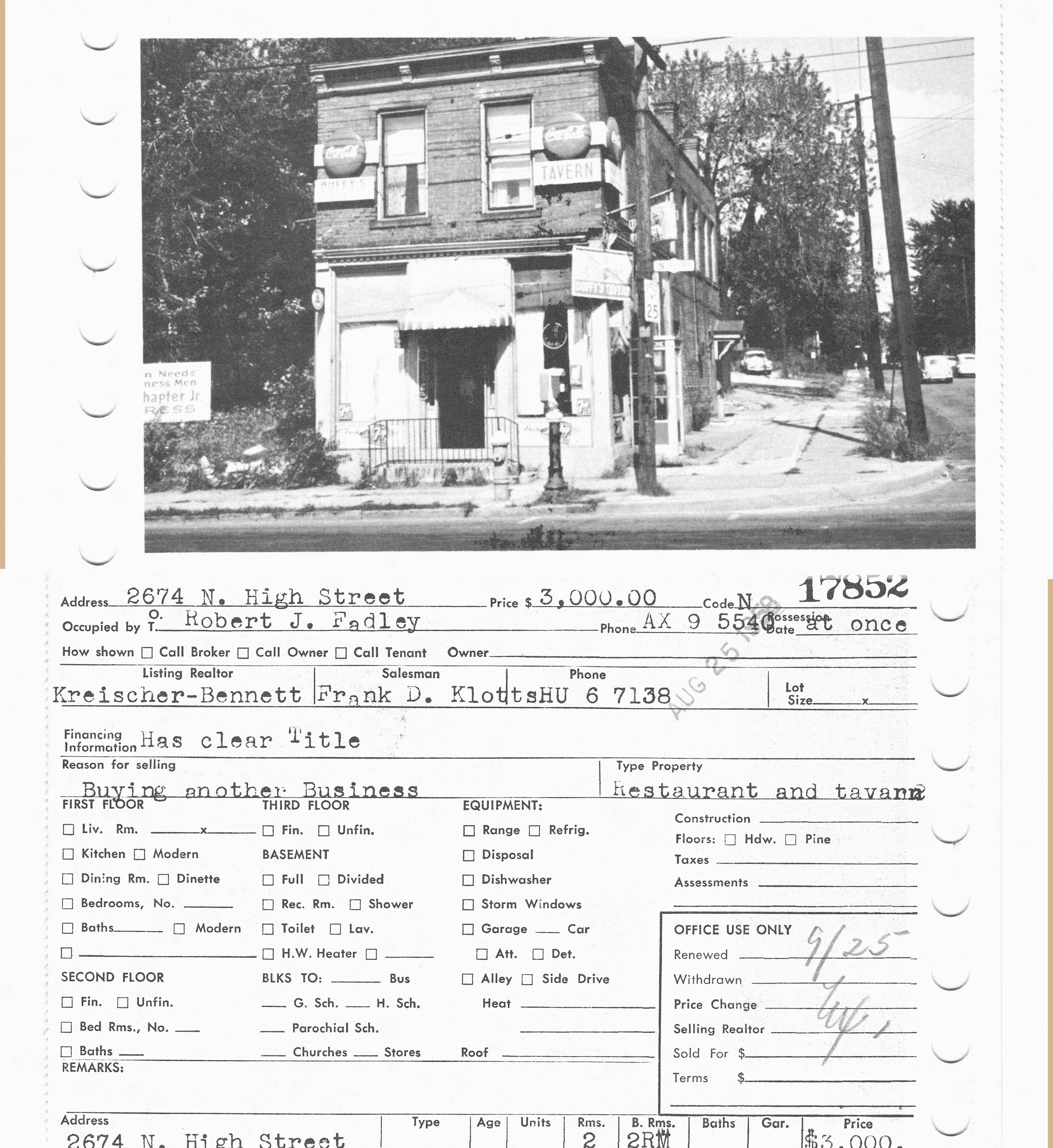 Wow, what a picture of the northeast corner of Dodridge and N High, where CVS Drugstore is today! This photo of 2674 North High was taken in 1959. Duffy’s Tavern had several owners over the years; in 1959 it was owned by Robert J Fadley and in 1947 it was owned by V. G. Hillon. In 1937 it was called Barney’s Grill. I believe it was a restaurant going back to at least 1924, as I found several “waitresses needed” ads in the Columbus Dispatch for the “Crouse American Restaurant” at 2674 North High, in 1924.